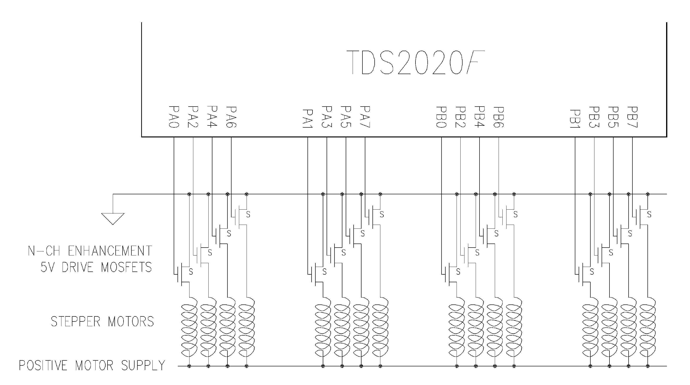 Stepper motor interface OVERVIEWThe library routine #4STEP.TDS supplied with the UPDATE SERVICE, page 38, drives four 4-phase stepper motors under interrupt from the TDS2020F. Your application code determines direction, speed and number of steps for each of the four motors. All can move simultaneously with different settings. For example 2 -100 250 DRIVE sends motor number 2 backwards by 100 steps at a speed of 250 units. The movement is done under interrupt so the processor is not held up while the action occurs. It can be doing other things like writing to a display, monitoring limit switches or creating an acceleration profile. See file #1STEP.TDS for an example of the latter. HARDWAREEach of the four stepper motors is connected to either the odd bits or even bits of Port A or Port B as follows: