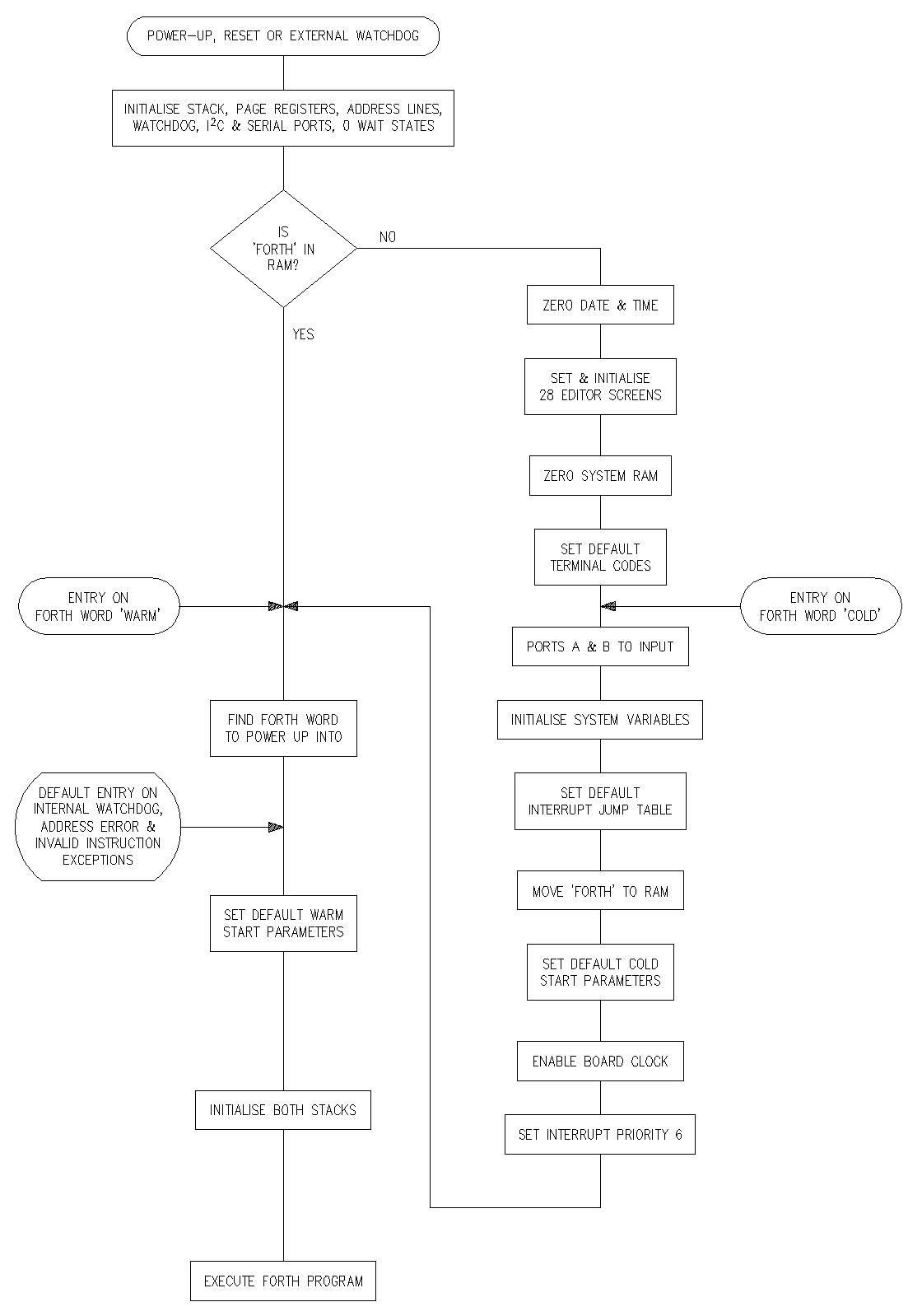 Only expert Forth users are likely to use words which need any of these to be set. If you use WORD , for example, BLK and IN will need initialising. When an application is put into PROM use only the Forth vocabulary. The number base will be decimal at power-up unless otherwise set in your initialisation. COLD START ROUTINEThe flow diagram shows what happens when power is applied to the TDS9092. It also has the actions of reset, internal trap and the words COLD and WARM . Note that even the former is not completely cold, when developing it would be inconvenient to have the clock zeroed for example. Install the utility _DOGCOLD.TDS to make resets or watchdog time-outs do a full cold start.