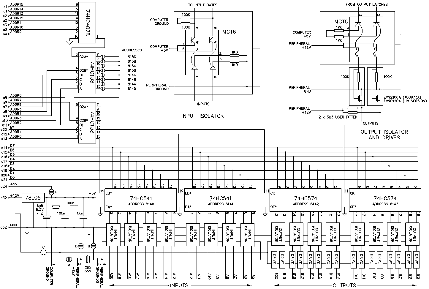 ** The +12V from the peripheral is used only on opto-isolated version TDS973A. It drives the output power MOSFET gates. Current consumption is 2mA maximum. If this is not available from the peripheral equipment use +5V for a slightly increased output impedance. If the peripheral has no power supply make links A, B and C in order to use the computer's +12V rail. The peripheral and computer grounds are now common however and some benefits of the opto-isolation are lost. On either board, making these links B and C can be useful in order to send the computer's +12V out to a peripheral with no supply of its own. If the +5V is preferred make links B and D.